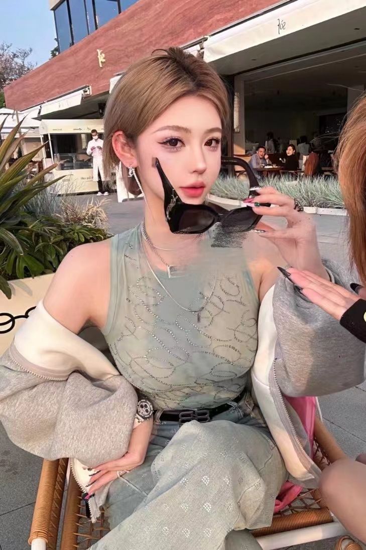 穿着一件白色的t恤,可以隐约看到里面红色的胸部。